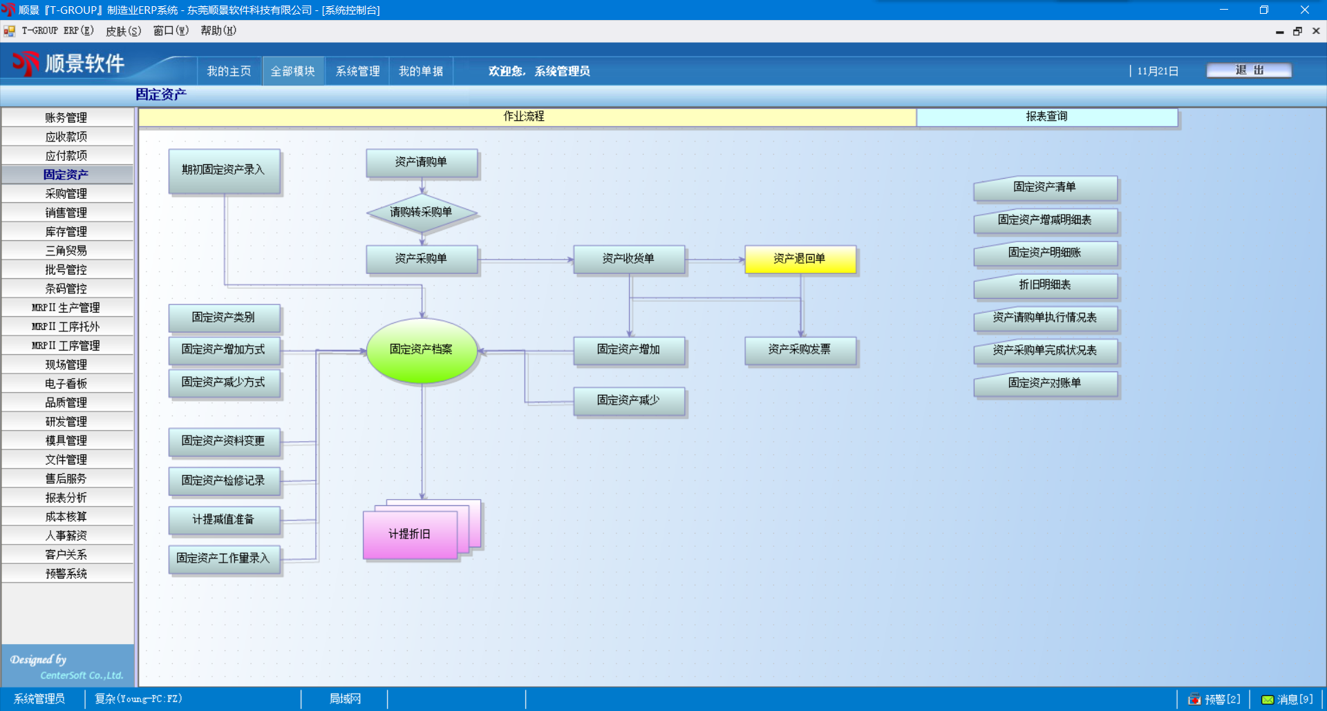 4.    对于资产的日常变动,系统提供资产改良、重估、报废、出售、调整等日常作业,可以重新计算帐面价值、折旧年限及折旧金额等信息。若为资产检修,可自动连至应付管理系统,自动生成应付凭单;若为资产出售,可自动计算处理损益,并自动结转生成应收管理系统的结帐单。所有日常变动均可生成对应的会计分录,供财务人员审核入帐。